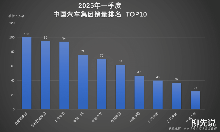 在众多车企中,比亚迪集团、吉利控股集团、上汽集团位居一季度销量前三甲,2025年前三个月累计销量分别为100万辆、95万辆和94万辆。比亚迪集团一季度销量突破百万辆大关,其中,比亚迪品牌销量约93万辆,创下中国汽车品牌季度销量新纪录,技术加产品铸就双冠王。